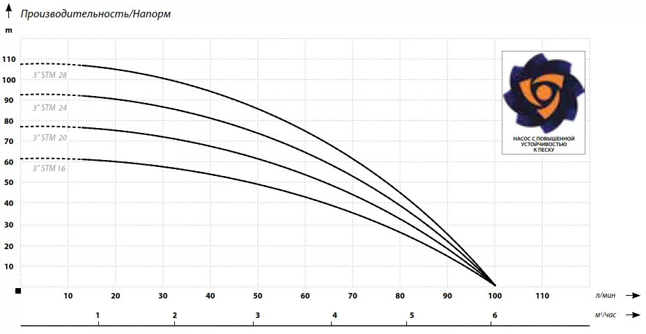 Многоступенчатые скважинный насосы диаметром 75 мм с повышенной устойчивостью к песку, рассчитанные на 3 и 4–дюймовые скважины. Насос IBO 3STM 16 кабель 20 метров обладает повышенной эффективностью к содержанию песка в перекачиваемой жидкости. Устойчивость к песку был достигнут благодаря использованию «плавающих лопастных колес» и выбору износостойких материалов. Скважинный насос IBO 3STM 16 кабель 20 метров обладает отменными характеристиками для насоса с небольшим диаметром. Максимальный напор насоса ИБО составляет 62 м, при этом максимальная производительность в пиковой точки показывает 6 м³/час. При таких напорно-расходных характеристиках мощность двигателя составляет всего 750 Вт. Конденсатор насоса встроен в двигатель, благодаря чему электрическая установка намного проще, чем в случае насосов со стартовой коробкой. Насос оснащен тепловой защитой, установленной в обмотке двигателя. Насос комплектуется кабелем 20 м. Основным преимуществом насоса IBO 3STM 16 кабель 20 метров является чрезвычайно высокая производительность для насоса диаметром 75 мм со скоростью до 6 м³/час.