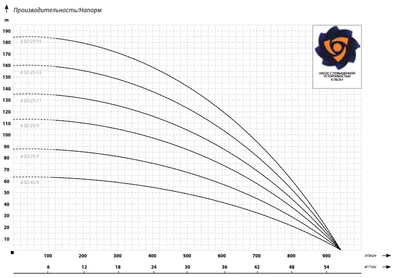 Трехфазный скважинный погружной насос IBO 6SD 25/7 диаметром 146 мм с повышенной устойчивостью к песку. Насос IBO 6SD 25/7 доступен к покупке с двигателями IBO и итальянскими двигателями IBO ITALY. В насосе IBO 6SD 25/7 используется технология «плавающих лопастных колес», а также для основных рабочих элементов насоса применяются износостойкие материалы: латунный нагнетательный патрубок, корпус, вал и сетка фильтра выполнены из нержавеющей стали AISI 304 / а также лопастные колеса выполнены из высококачественной пластмассы, Благодаря этому насос IBO 6SD 25/7 имеет повышенную стойкость к песку. Насос комплектуется кабелем 1 м, по желанию его можно нарастить до нужного размера. Скважинный насос IBO 6SD 25/7 имеет отличные характеристики. Напор насоса в максимальной точке составляет 89 м, а производительность достигает максимального показателя в 55.2 м³/час. Мощность двигателя составляет 7500 Вт, то вполне неплохо для насоса с такими напорно-расходными характеристиками. Насосы серии SD марки ИБО были первыми насосами на рынке, названными «анти–песочными». Они по прежнему являются одними из немногих скважинных насосов на рынке, которые имеют конструкции с такой высокой устойчивостью к песку. Максимальное содержание песка в воде – до 5%. Насос IBO 6SD 25/7 можно применять как аналог насосов ЭЦВ.