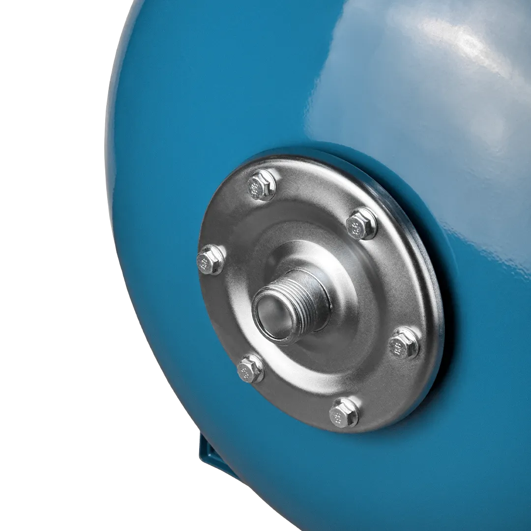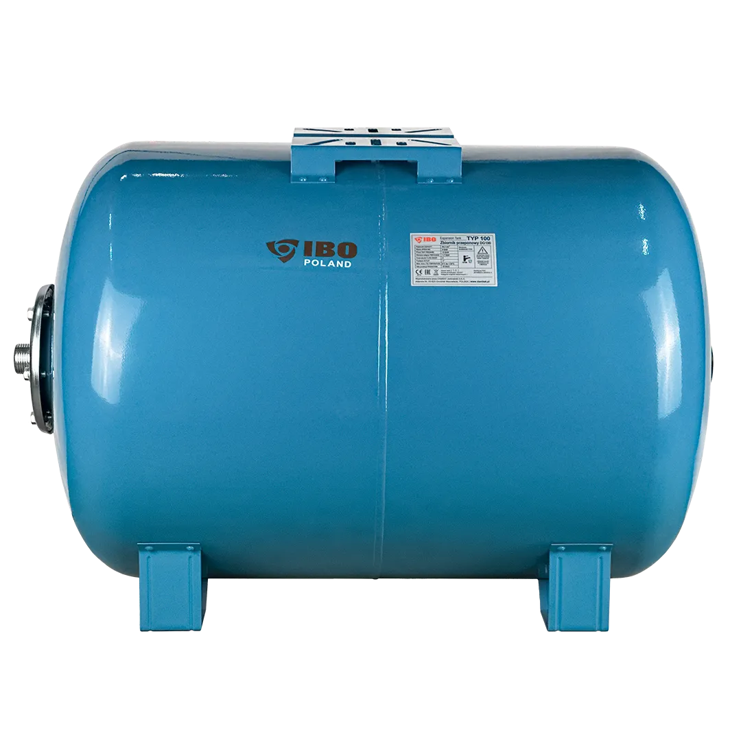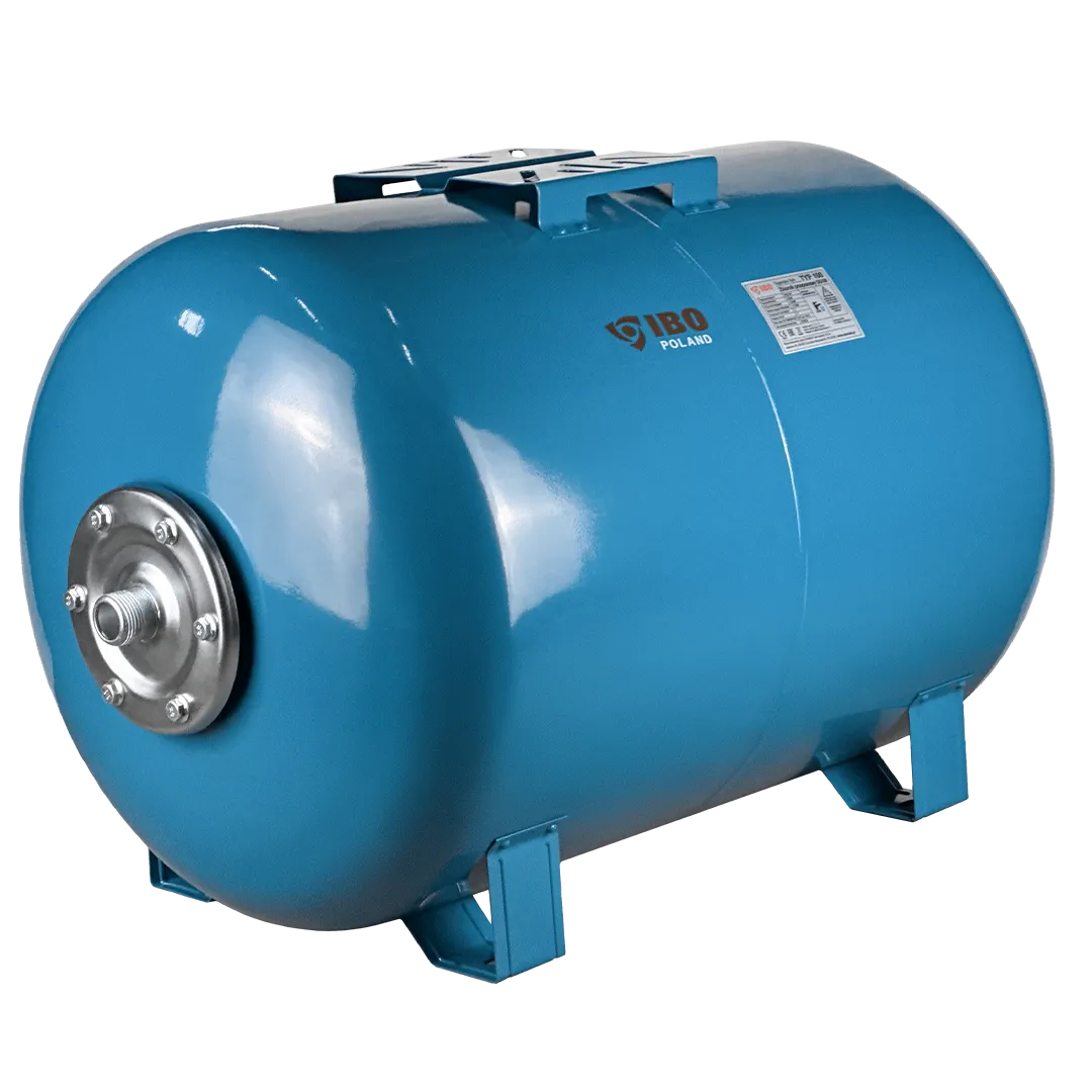 Горизонтальный мембранный бак для воды IBO объемом 100 литров. Бак выполнен из стали и покрыт специальным антикоррозионным составом. Мембрана бака выполнена из пищевой резины на основе бутилкаучука. Бак снабжен приварной площадкой для установки поверхностного насоса. В нижней части бака установлены металлические кронштейны с целью крепления бака к поверхности.