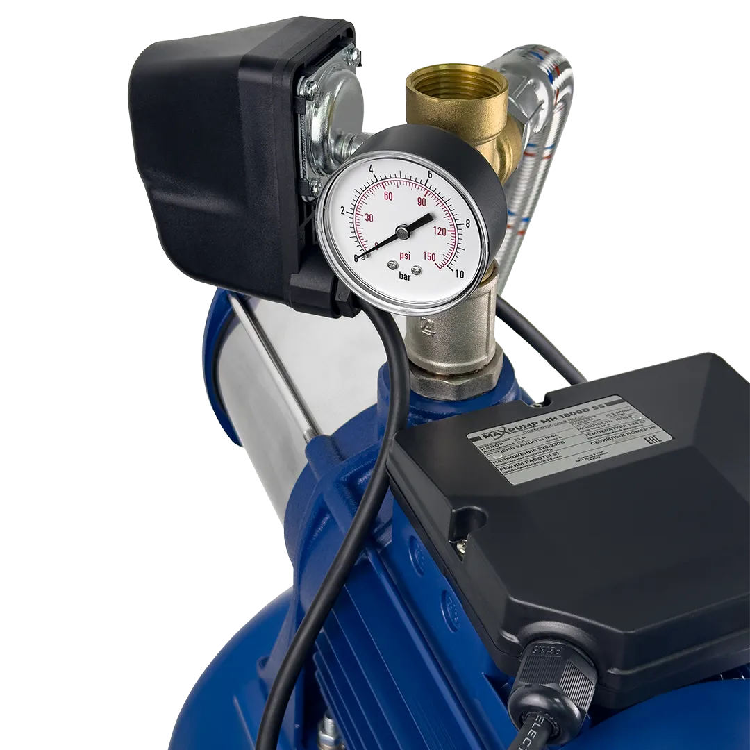 Комплект (Поверхностный насос MAXPUMP MH 1300D SS рабочие колеса из нержавеющей стали, Горизонтальный бак MAXPUMP 24л, Реле давления Italtecnica РМ/5 G14, Пятипозиционный латунный штуцер MAXPUMP, манометр особопрочный MAXPUMP B32-3/T D 63 мм 1/4" аксиальный, Подводка гибкая Italtecnica FAF1060MFC 1" 60 см)