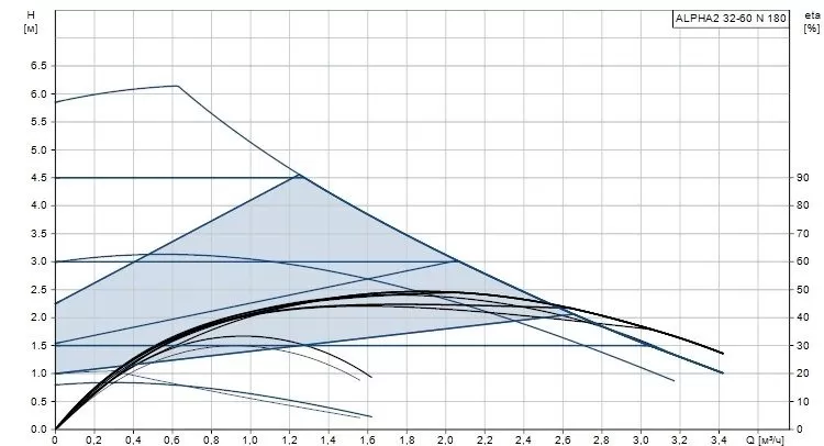 Циркуляционный насос Grundfos ALPHA2 32-60 N NEW используется для циркуляции воды или гликольсодержащих жидкостей в регулируемых системах отопления и в системах отопления с переменным расходом. ALPHA2 NEW оснащены 10 режимами управления: 3 режима фиксированной скорости, 3 режима пропорционального давления, 3 режима постоянного давления и наиболее энергоэффективный режим для работы в контуре с радиаторами: режим AUTOADAPT.