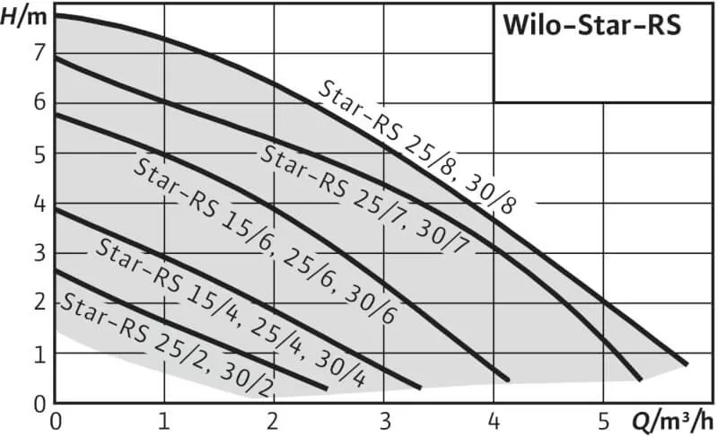 Циркуляционный насос WILO STAR-RS 30/7 с мокрым ротором для установки в трубах с ручной трехступенчатой регулировкой частоты вращения. С устойчивым к токам блокировки электродвигателем. Корпус насоса из серого чугуна (в зависимости от типа может применяться бронза), рабочее колесо из упрочненного стекловолокном синтетического материала, вал из нержавеющей стали с угольными подшипниками скольжения с металлической пропиткой.