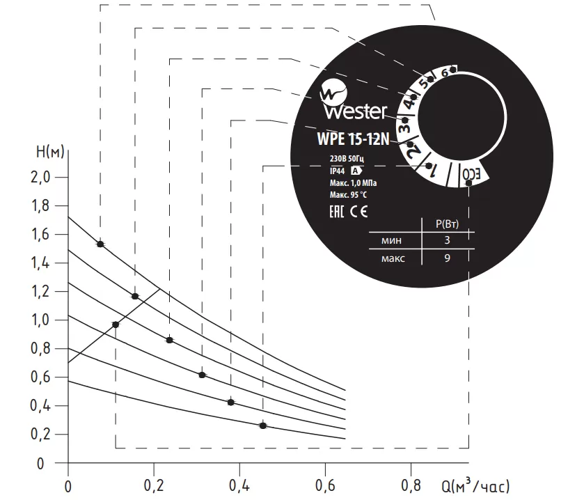 Циркуляционный насос WPE 15-12N предназначен для постоянной циркуляции жидкости в системах: бытового горячего водоснабжения, небольших системах отопления, вентиляции и кондиционирования. Высокая энергоэффективность до 80% достигается благодаря синхронному двигателю на постоянных магнитах с частотным регулированием. Энергоэффективность насоса – класс «А». Насос имеет несколько режимов работы: 6 фиксированных скоростей в зависимости от характеристик гидравлической системы и режим ЕСО, при котором осуществляется автоматическая настройка характеристик насоса в соответствии с параметрами гидравлической системы